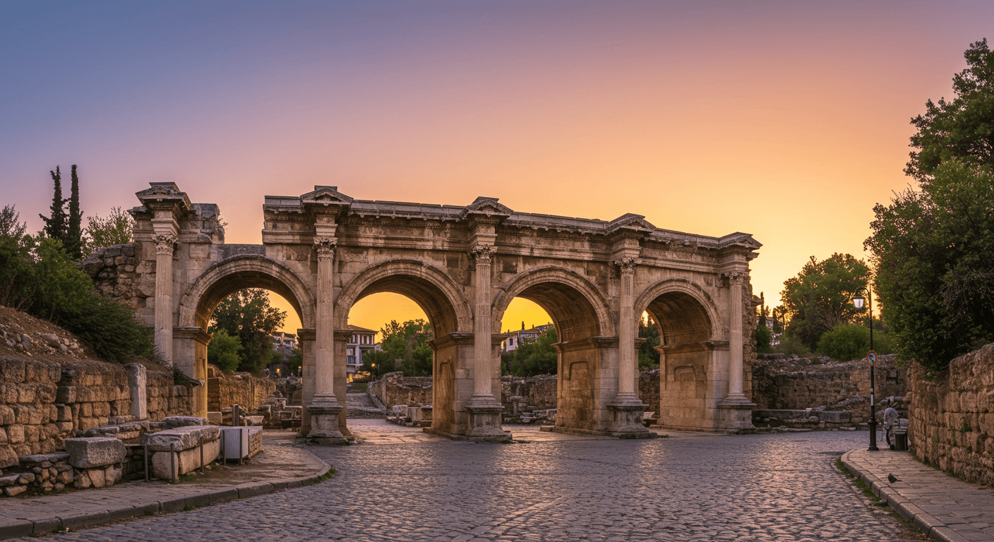 Das wohl bekannteste Wahrzeichen ist das Hadrianstor, ein prächtiger Triumphbogen, der im Jahre 130 n. Chr. zu Ehren des römischen Kaisers Hadrian erbaut wurde. Es markiert den Eingang zur Altstadt und ist ein beeindruckendes Beispiel römischer Baukunst mit seinen drei Bögen und reich verzierten Säulen. Ein weiteres Highlight ist der Yivli-Minare-Moschee-Komplex, dessen gerilltes Minarett ein Symbol der Stadt ist und von den Seldschuken im 13. Jahrhundert errichtet wurde. In der näheren Umgebung finden sich zudem die antiken Städte Perge, Aspendos und Termessos, die mit ihren gut erhaltenen Theatern, Agora und Tempeln tiefe Einblicke in das Leben der Antike gewähren.