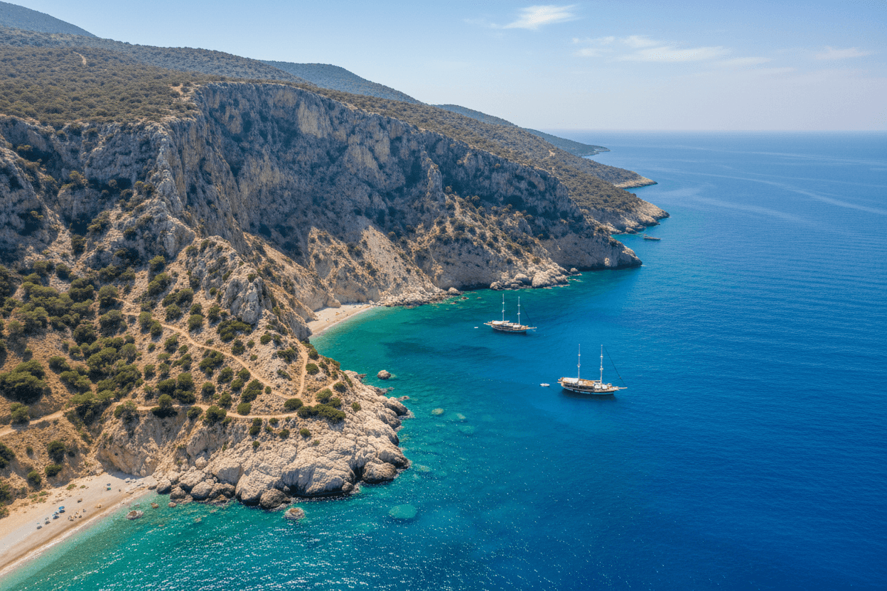 Die Natur der Türkei ist ebenso vielfältig wie ihre Kultur und ein Paradies für Outdoor-Enthusiasten. Entlang der Ägäis- und Mittelmeerküste erstrecken sich goldene Sandstrände und versteckte Buchten mit kristallklarem Wasser. Orte wie Ölüdeniz mit seiner berühmten Blauen Lagune oder die unberührten Abschnitte der Lykischen Küste laden zum Schwimmen, Schnorcheln und Entspannen ein, oft umrahmt von dichten Pinienwäldern.