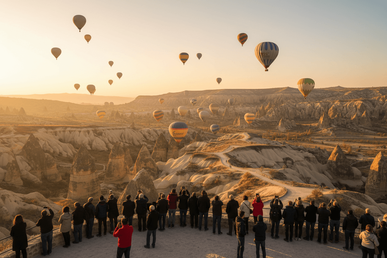 Um das Spektakel der aufsteigenden Ballons in seiner vollen Pracht zu genießen, ist die Wahl des richtigen Aussichtspunkts entscheidend. Beliebte und bewährte Orte wie das Love Valley, Rose Valley oder das Göreme Panorama bieten spektakuläre Perspektiven. Viele Besucher versammeln sich hier schon vor Sonnenaufgang, um die besten Plätze zu ergattern und ihre Kameras bereitzuhalten, um diesen magischen Moment festzuhalten.