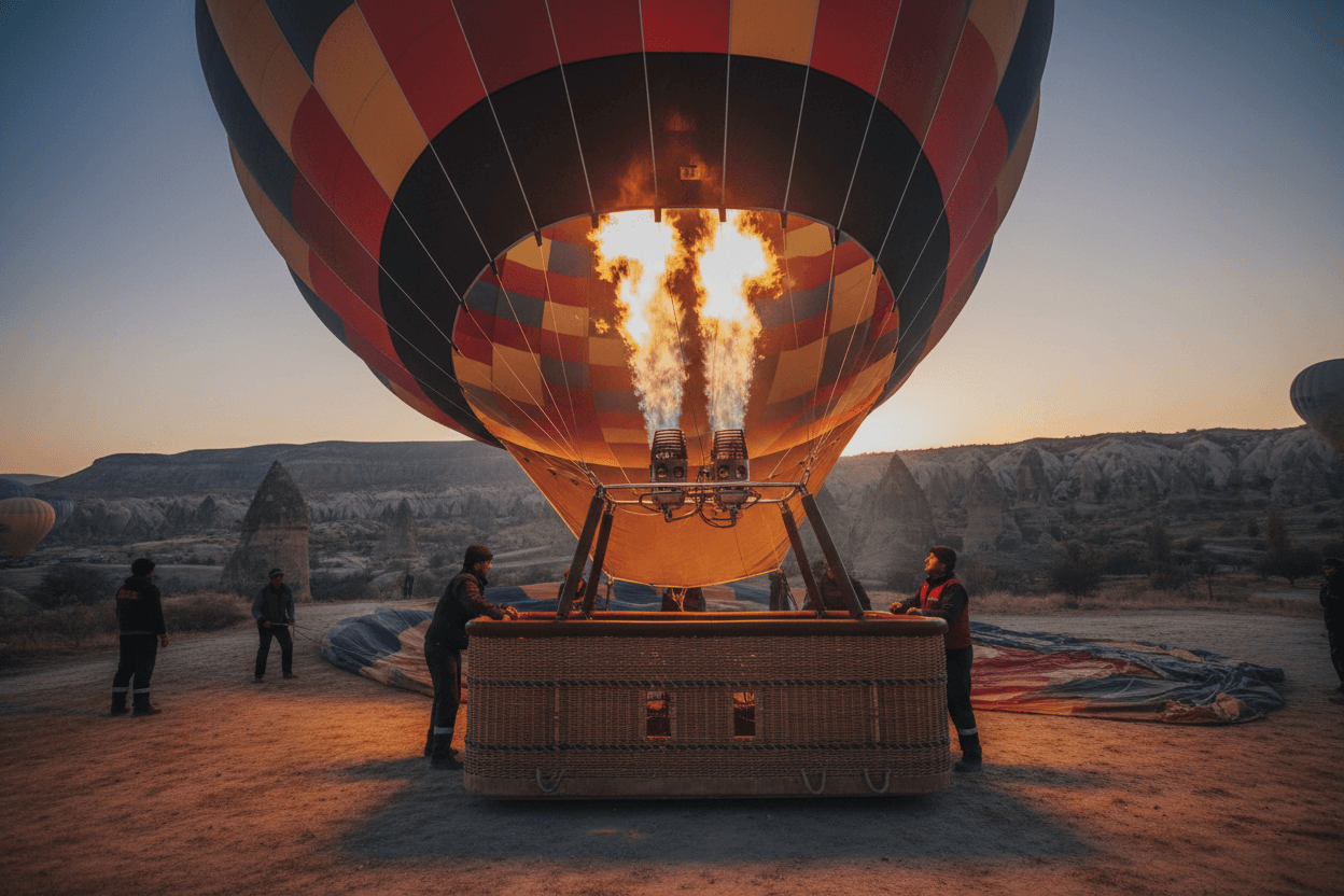 Ein weiterer ausgezeichneter Punkt für die Kappadokien Ballonbeobachtung ist der Ballonstartplatz selbst. Hier können Sie die Vorbereitungen hautnah miterleben: wie die riesigen Hüllen langsam aufgeblasen werden, sich die Gondeln füllen und die Piloten die letzten Checks durchführen. Die Energie und Aufregung am Startplatz sind ansteckend und bieten eine ganz besondere, intime Art, das Spektakel zu erleben.