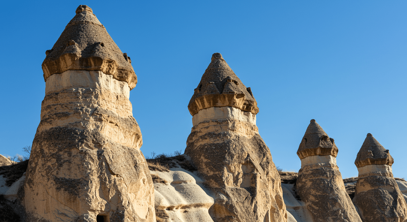 Die Feenkamine, auf Türkisch „Peri Bacaları“ genannt, sind das unbestreitbare Wahrzeichen Kappadokiens. Diese turmähnlichen Felsformationen mit ihren „Hüten“ aus härterem Gestein entstanden durch Erosion und bieten ein Spektakel, das man kaum in Worte fassen kann. Besonders beeindruckend sind sie in Tälern wie dem Pasabag (Mönchtal), wo einige sogar über mehrere Kappen verfügen, und im Devrent-Tal (Imaginäres Tal), wo die Felsen Tiere und andere Formen zu imitieren scheinen.
