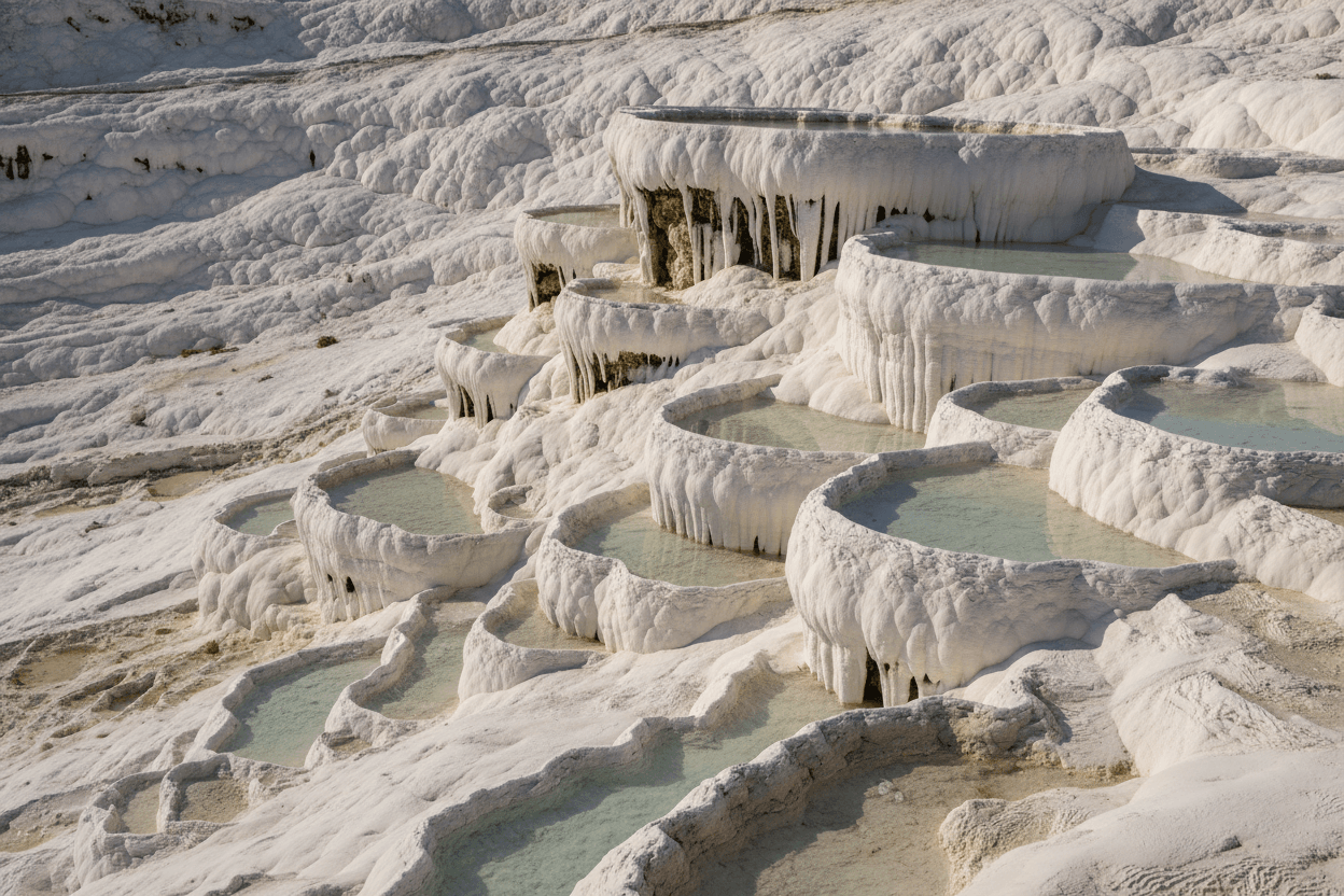Das Geheimnis der makellosen weißen Pracht Pamukkales liegt in seinen mineralreichen Thermalquellen. Wasser, das tief aus dem Erdinneren aufsteigt, ist stark mit Kalziumkarbonat angereichert. Sobald dieses Wasser an die Oberfläche tritt, reagiert es mit der Luft, kühlt ab und setzt das gelöste Kalziumkarbonat als weichen Kalkschlamm ab.